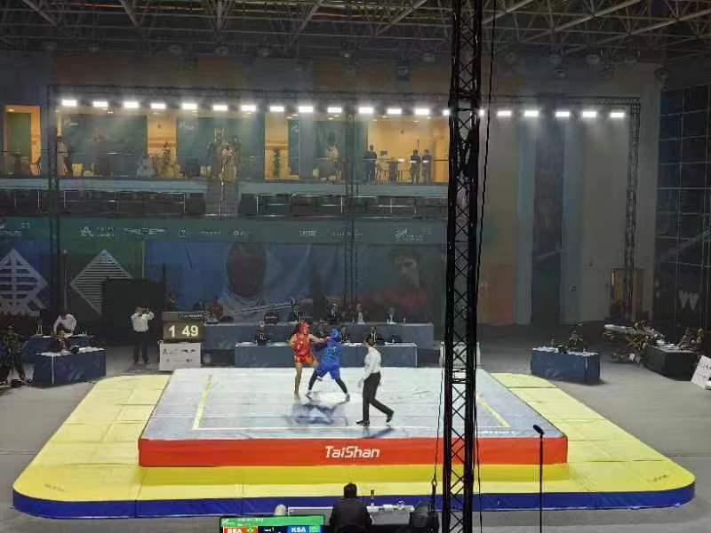 第三届世界武搏运动会武术比赛于10月21日至22日在沙特国王大学体育馆进行,吸引了来自五大洲的31个国家和地区的近80位运动员参赛。武术项目首个比赛日中,共产生男子长拳与女子长拳两枚金牌。其中,尼泊尔、中国各获一金。作为本届世界武搏运动会器材供应商与服务商,中国·3003体育再一次助力世界武搏运动会的高水平举办。