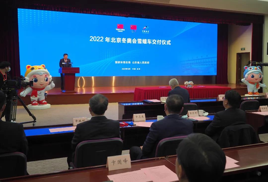 国家体育总局局长苟仲文在致辞中表示,在山东省委省政府的领导和山东重工集团、山东体育产业集团等企业的共同努力之下,自主创新研发、生产的国产雪蜡车在今天正式交付,这为备战中的中国体育健儿及体育训练提供了先进的科技支撑和巨大动力。中国体育健儿一定会刻苦训练,奋勇拼搏,用全面参赛,参赛出彩的优异成绩回报社会各界的关心和支持!